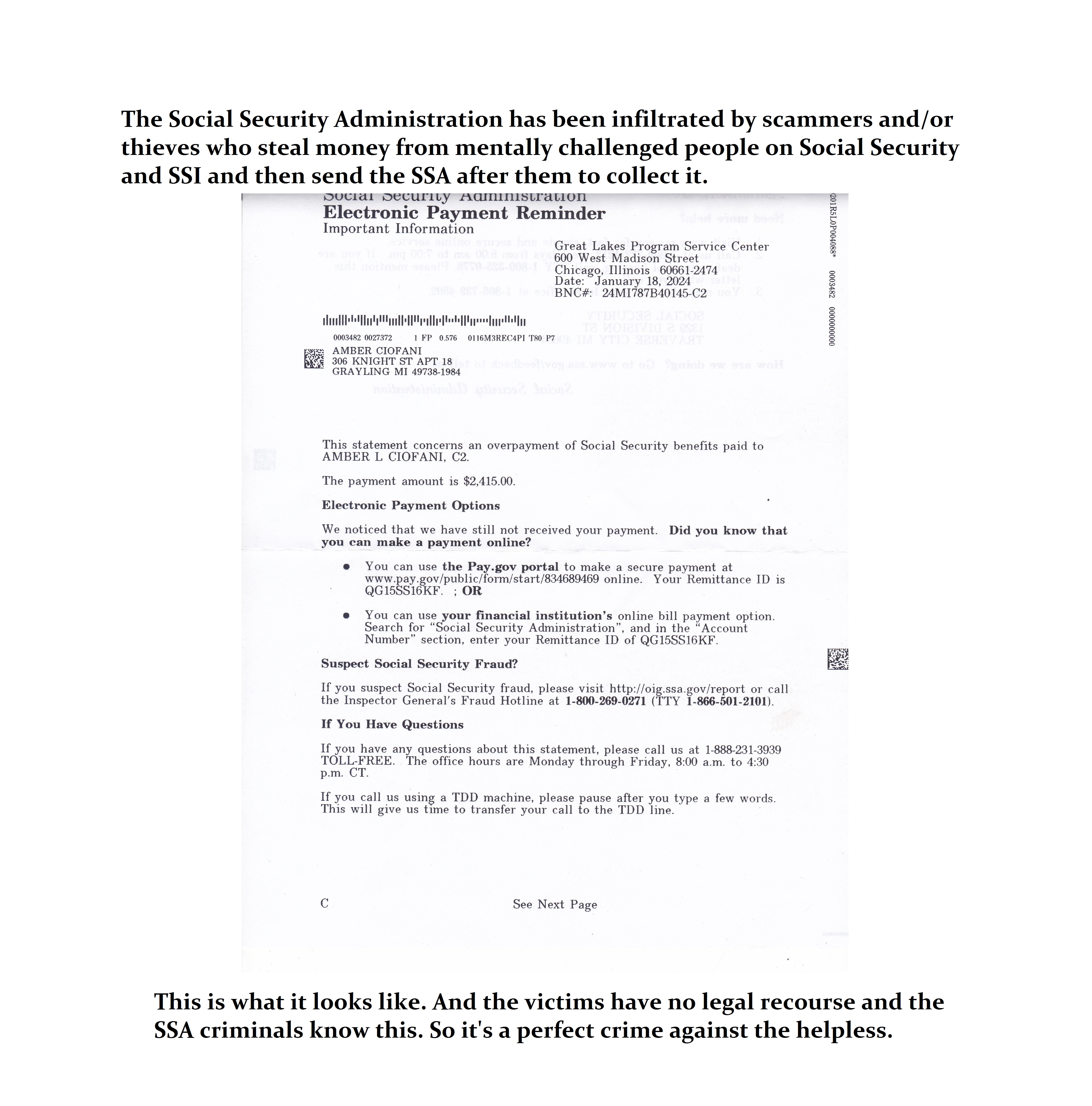 There are laws to protect mentally challenged people like Amber Ciofani from exploitation. Who would've thought that she'd need those laws to protect her from the thieves and scammers who infiltrated the Social Security administration? They don't seem to grasp the illegality of what they're perpetrating on Amber Ciofani, who's on Social Security and SSI due to her mental health condition. They recently stole all but $75 (over $400) of her SSI grant in February and the amount that they erroneously say she owes never went down. The thieves obviously intend to due this to her perpetually. Never applying what they steal to the amount they say she owes. Notice how they didn't do this while Amber had a conservator. They waited until she became her own conservator to start victimizing her. They started it over a fairytale "overpayment" of over $10,000!! Even a sloppy conservator would've caught that if it actually happened. But it never did. Amber was never "overpaid", she never received a dime that she wasn't legally entitled to. She should be able to sue them for slander and fraud. It'd be nice for something bad to happen to these criminals.